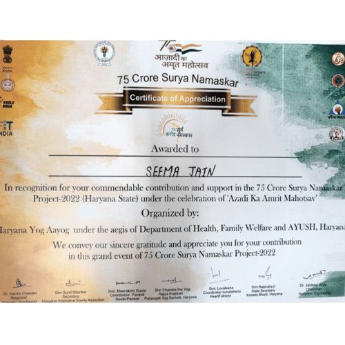 Honoured by Ayush Mantralaya, Haryana Government of India in the year 2022 under the celebration of 'Azadi ka Amrit Mahotsav'.