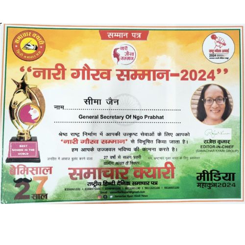 Honoured by Samachar kyari patrika in 2024 and 2025 as 'Nari Gaurav Samman' working for the welfare of divyaangjan.